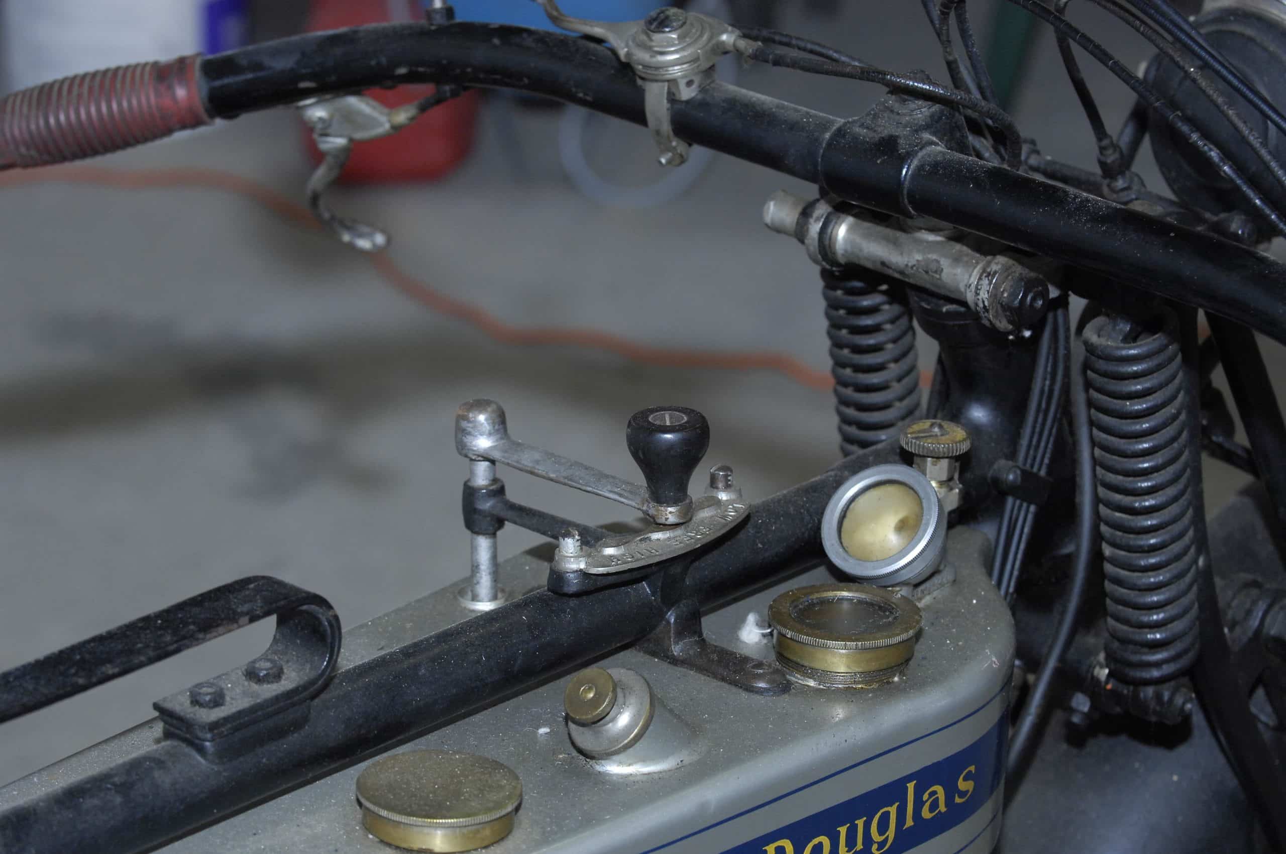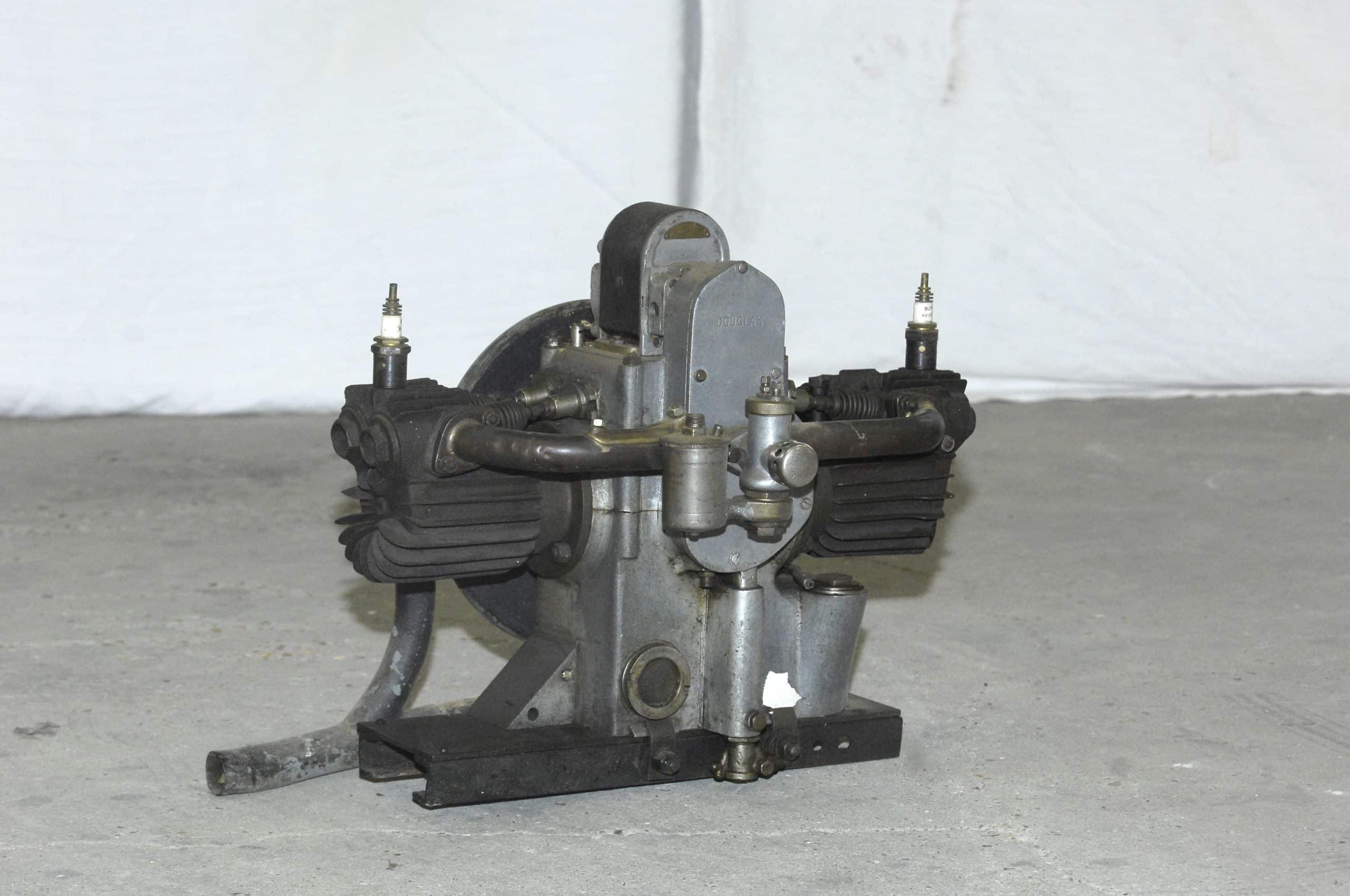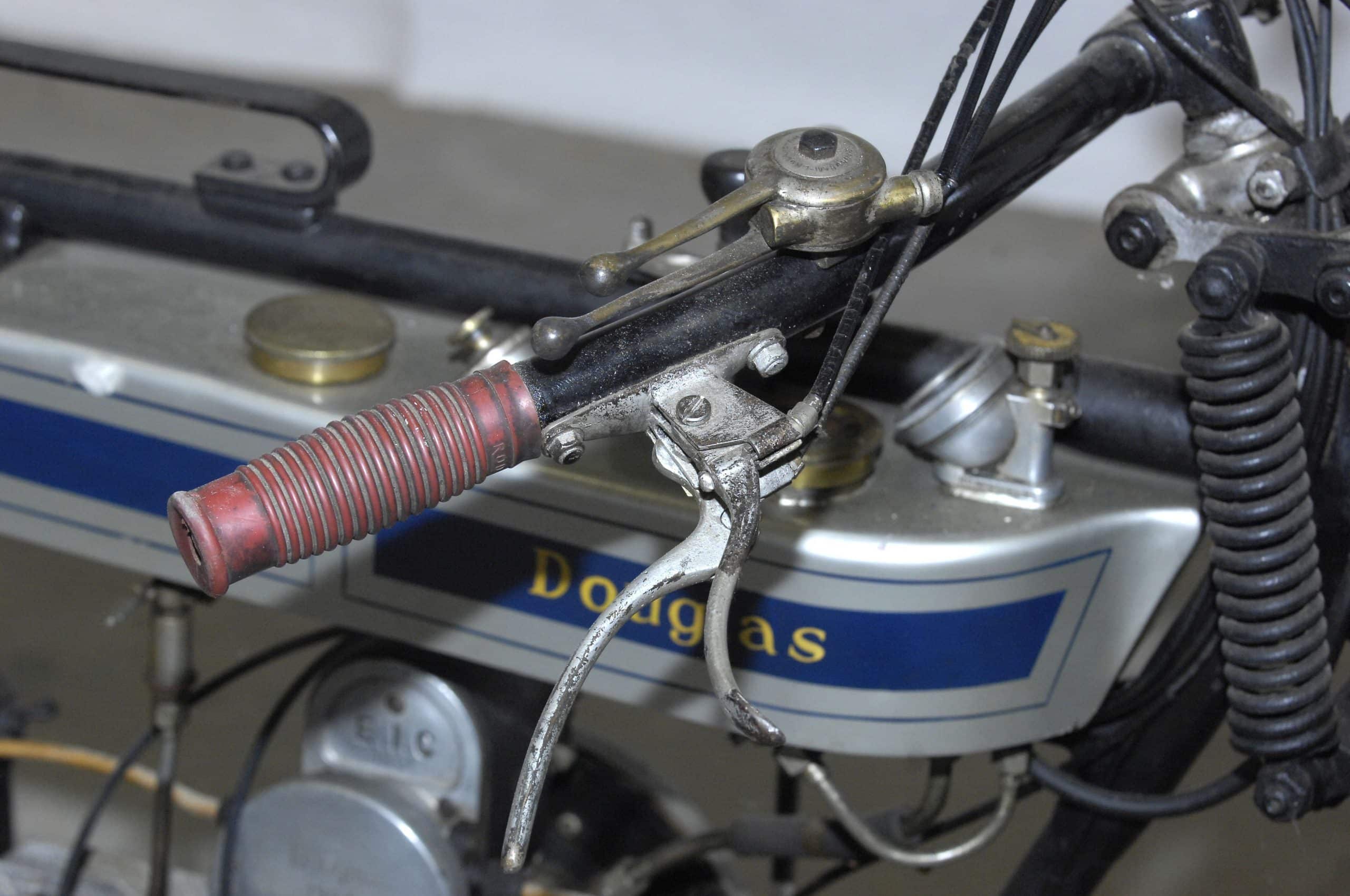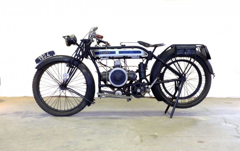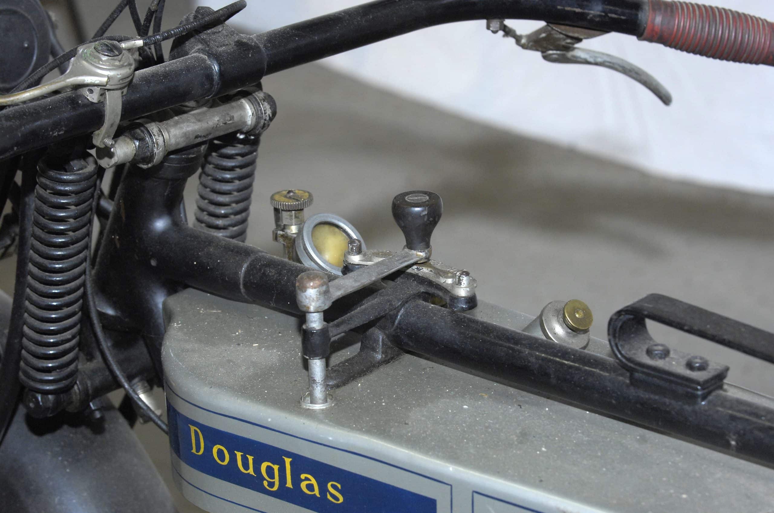 Douglas is gevestigd in Bristol en is een merk dat ondanks talrijke wisselvalligheden, gedurende een halve eeuw motorfietsen geproduceerd, van 1907 tot 1957. Uitgerust met een in lengterichting in het frame geplaatste flat-twin-motor, is deze Douglas 350 cc met zijkleppen in rechte lijn afgeleid van de machines waarmee de Engelse expeditie-rijders tijdens WOI. Deze betrouwbare en beproefde machine onderscheidt zich ook door zijn versnellingsbakbediening: de twee verhoudingen worden geregeld door een stang die door de tank gaat en die eindigt in een transmissie waarmee versnellingen kunnen worden geselecteerd. Voorzien van zijn perioderegistratie uit 1926 en verlichting is deze machine compleet en heeft een mooie patina.
