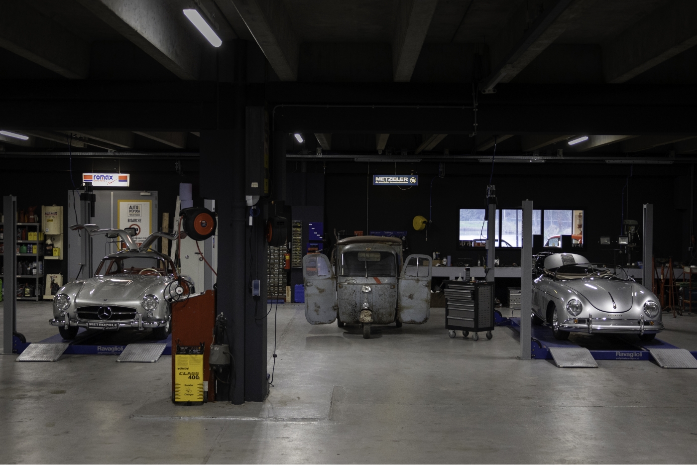 Vanzelfsprekend beschikt Metropole Sales over een eigen werkplaats, waar een team van specialisten elke auto zorgvuldig checkt en gereedmaakt voor verkoop. Er kunnen kleine reparaties en een apk worden uitgevoerd, maar zelfs volledige restauraties behoren tot de mogelijkheden. Het professionele werkplaatsteam met zowel personenauto- als vrachtwagenspecialisten bestaat zonder uitzondering uit klassiekerliefhebbers.